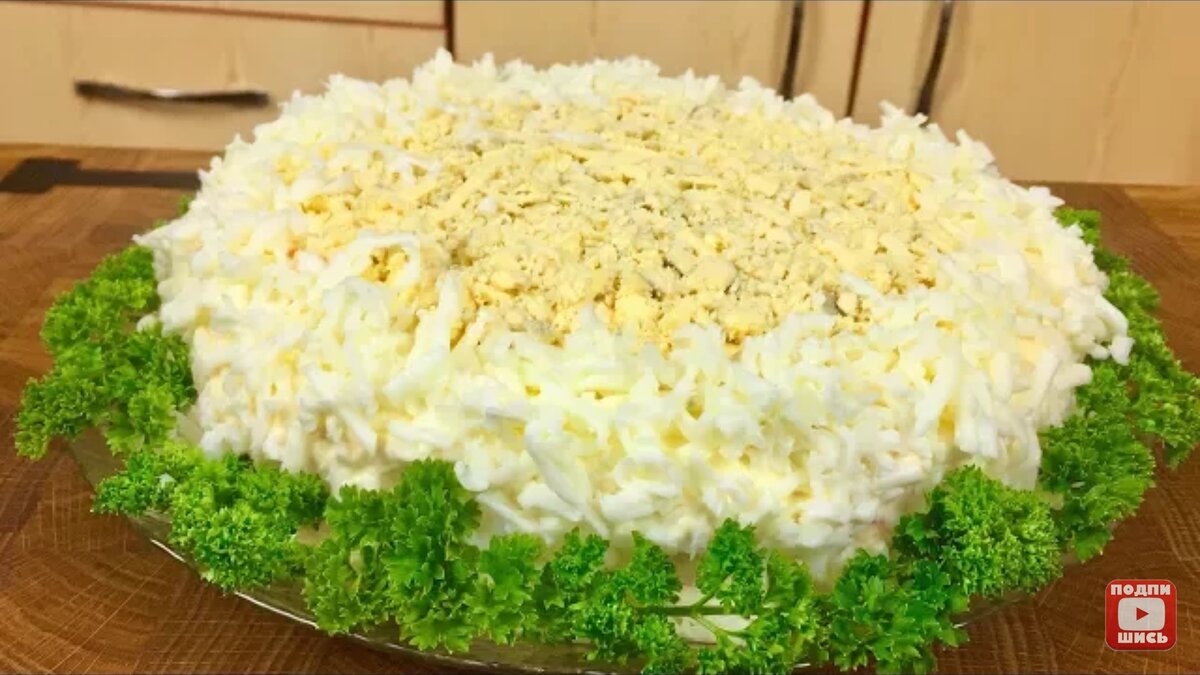 Давайте возьмём классический и избитый рецепт салатика "Мимоза" и внесём в него ИЗЮМИНКУ - заменим приевшуюся рыбу на НЕЖНЕЙШУЮ ПЕЧЕНЬ ТРЕСКИ!!! Хотите удивить домашних и гостей ВАРИАЦИЕЙ на старую кулинарную тему? Тогда смелее вперёд! РЕЦЕПТ: Картофель 370 гр. Морковь 200 гр. Яйца 3 шт. Твёрдый сыр 130 гр. Печень трески 1 банка Майонез по вкусу. Зелень петрушки для украшения В конце странички, можно зайти на ВИДЕО этого рецепта на моём YouTube канале. Загляните!!! Там ещё много разных вкусняшек. А теперь, совершенно несложный ПОШАГОВЫЙ РЕЦЕПТ: На "подушечку" из натёртого, отваренного картофеля нанести тонкий слой майонеза. Впрочем, толщина слоя зависит от вашего вкуса! Теперь добавляем печень трески. Распределяем по кругу. Сверху натрём отварную морковку. Распределим по всей поверхности. Опять майонез А теперь, затяните весь салатик майонезом. В серединку натрём желток и распределим его, не доходя до краёв. Оставшуюся поверхность и бока украсим тёртым белком. И всё украс