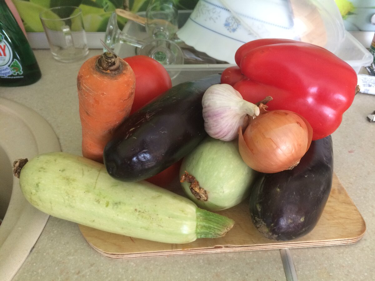 Покупаем: Баклажаны, кабачки, морковь, лук, чеснок, перец, помидоры Блюдо состоит из двух частей, по этому сначала мы займемся соусом или поджаркой кому как удобно называть) Для этого нужно: нарезать лук и перец, морковь натереть на терке, а чеснок порубить Масло налито Жарим лук , добавляем морковь Потом перец Делаем надрезы на помидоре Заливаем кипятком Кожица отходит как надо Добавляем их туда же и не забываем про чеснок Посыпаем перцем, солью и прованскими травами Жарим на сильном огне пока помидоры не дадут сок Немного пикантности Закрываем крышкой и тушим на медленном огне. Теперь занимаемся второй частью Режем баклажаны, кабачки, морковку и помидоры на пятаки. Солим перчим все кроме помидоров по вкусу. Укладываем в тару как угодно К этому времени поджарка или соус готовы Высыпаем все сверху и разравниваем Накрываем фольгой и в духовку на 1 час при 180гр. Готово! Можно посыпать сыром