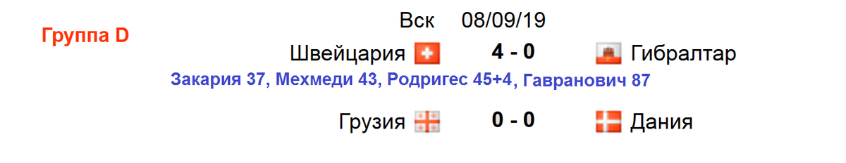 8 сентября были сыгранны матчи в нескольких группах. Представляем вашему вниманию результаты, таблицы и расписание. Группа D. Турнирная таблица и расписание. Группа J. Турнирное положение. В группе F состоялось две игры с участием микро сборных. Румыния обыграла Мальту, которая сопротивлялась. Минимальный результат говорит о непростой судьбе победителя. Мальта имеет черный отрезок из 5ти проигранных матчей кряду. Испания, хоть и забила в дебюте Фарерам, однако первый тайм закончился всего лишь с минимальным перевесом Фурии Рохи. Дальше испанцы не церемонились… Испания побеждает в 7-й игре подряд. Фареры терпят поражение в 6-м матче кряду. Швеция спаслась в поединке с Норвегией. Норвежцы набрали ход. Сборная, которую тренирует швед, не уступает никому на протяжении 5 игр. В прошлой игре команды сыграли в результативную ничью 3:3. Самое приятное, посмотреть на таблицу после сыгранных матчей. Список бомбардиров после вчерашнего дня не изменился. 9 сентября в понедельник о