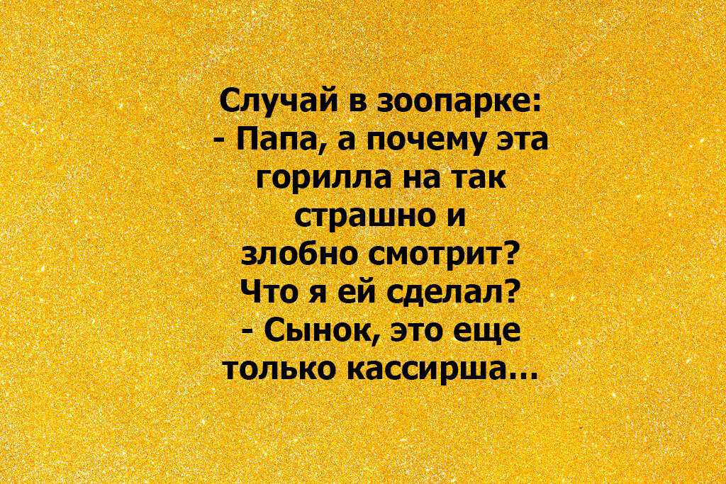Дети психолога никогда не просят маму купить им что-то в магазине на прямую. Как правило они начинают разговор с более отвлеченной темы, например: «Мама, а скажи, у тебя тоже было тяжелое и безрадостное детство как и у меня?» **** Встреча двух знакомых: - Привет! А ты в курсе, что твою жену сегодня в роддом отвезли? - Нет. А что с ней случилось? - Вообще без понятия… **** - Ну и почему ты опять опоздал? - Так получилось, я поздно с дома вышел. - А мог бы и раньше выйти! - Уже было поздно раньше выходить из дома. **** Преподаватель русского языка только со временем понял, что две полоски это не всегда сказуемое. **** Случай в зоопарке: - Папа, а почему эта горилла на так страшно и злобно смотрит? Что я ей сделал? - Сынок, это еще только кассирша… **** Разговор студента с деканом: - Здравствуйте! Ну рассказывайте, почему вы собрались поступать именно в наш университет? Чем он вам так понравился и почему не выбрали другой? - Папа, ну что за странные вопросы? **** Разговор врача с пацие
