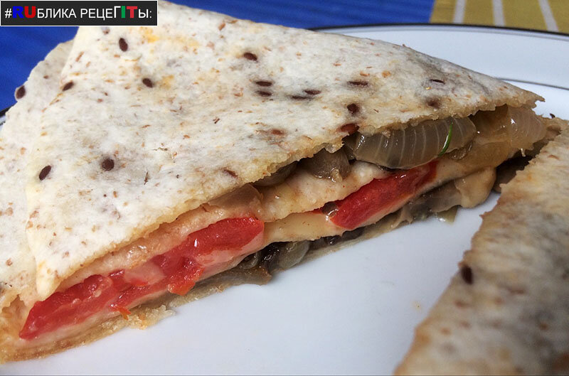 Легкий, вкусный обед за 7 минут! Ингредиенты · Лепешка-тортилья без дрожжевая 2 шт. · Помидор 2 шт. · Сыр твердых сортов 100 г. · Грибы 100 г. · Половина большой луковицы · Соль, перец по вкусу · Растительное масло Приготовление 1. Обжарить грибы с луком до состояния готовности на растительном масле, соль и перец положить по вкусу 2. Круглую лепешку свернуть пополам внутрь положить лук с грибами. Затем свернуть еще раз и положить в разворот, нарезанный кружочками помидор, посыпать тертым сыром 3. Положить в разогретую до 200 градусов духовку на 5-7 минут Приятного аппетита!