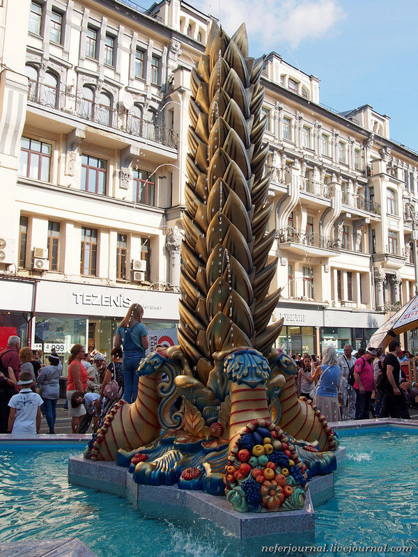 Знаменитый фонтан "Золотой колос". Оригинал построен в 1950-х годах на верхнем пруду ВДНХ. Долгое время фонтан не работал. Недавно его отреставрировали и запустили заново. Это один из трех главных фонтанов ВДНХ. Его высота 16 метров. На Тверской установили уменьшенную копию. Но это реально фонтан, из него прыскает вода! Даже монет в бассейн накидали.