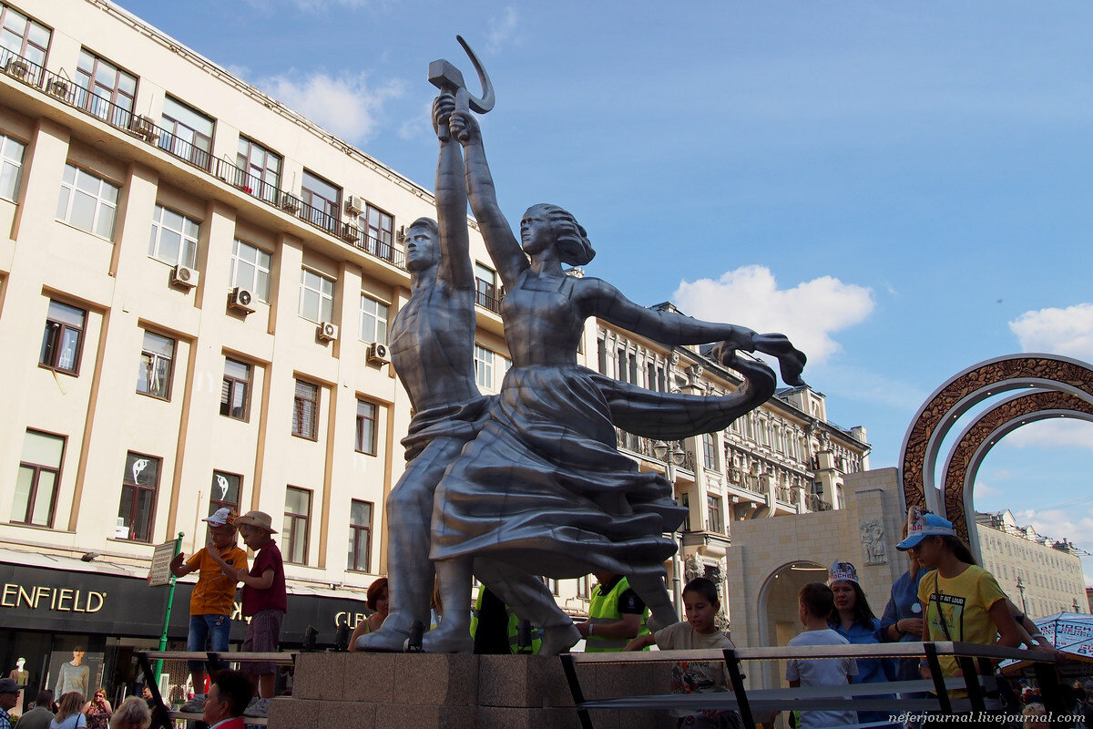 На Тверской построили маленькую ВДНХ! За сутки соорудили павильоны, скульптуры и фонтаны. Часть улицы от Бульварного кольца до Кремля сделали пешеходной. Народу было много, но гораздо меньше, чем обычно. Все потому, что кому-то в голову пришла здравая мысль распределить людей по всей Москве, в этом году мероприятия проходили по всему городу, а не только в центре.