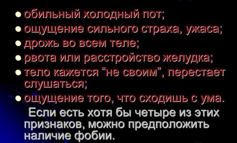 В последнее время, появилась тенденция приписывать себе все возможные фобии. Давайте, разберемся, что такое фобия, а что такое страх. Страх – внутреннее состояние, вызванное действительной или приближающийся угрозой. Страх стимулирует организм, пробуждает стремление действовать. Это базовая эмоция человека, зависит от ряда внутренних и внешних, врожденных и приобретенных факторов Главными функциями являются: защита, сигнальная, поисковая, адаптационная. Фобия – это симптом. Смысл которого состоит в алогичном, неподдающемуся контролю страхе или излишней тревожности. Выявляется в конкретных ситуациях или в присутствии объекта. В психиатрии под термином «фобия» понимается неотступный, навязчивый, резко выраженный страх, который не поддается логическому объяснению. В конечном итоге развития такой боязни человек начинает сторониться некоторых типов деятельности, ситуаций или объектов. Одолеть неконтролируемый страх на этапе формирования абсолютно реально. Однако если вовремя не принять меры
