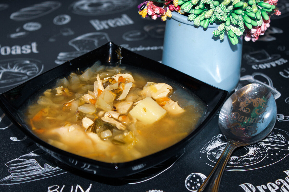 Я его сварила из того что было. Получилось очень даже вкусно. Ингредиенты: Вода - 3 литра Куриная грудка - 2 шт. Картофель - 2 шт. Лук - 1 шт. Морковь - 1 шт. Капуста - 1/2 шт. Горох - 4 ст.л. Укроп - пучок Соль, перец - по вкусу Растительное масло для жарки Приготовление: 1. Налить в воду кастрюлю. Мясо промыть, положить в кастрюлю и поставить на плиту. Варить на слабом огне минут 30 (до готовности мяса). После мясо вытащить из бульона. 2. Лук измельчить, морковь натереть на крупной терке. Спассеровать на растительном масле до золотистого цвета. 3. Капусту мелко нашинковать, Картофель очистить и нарезать небольшими кубиками. Горох промыть. Добавить все в бульон. Варить 15 минут. 4. Отварное мясо нарезать небольшими кусочками. Укроп измельчить. 5. Положить в кастрюлю мясо, укроп, зажарку, посолить. Варить еще 5 минут и выключить.