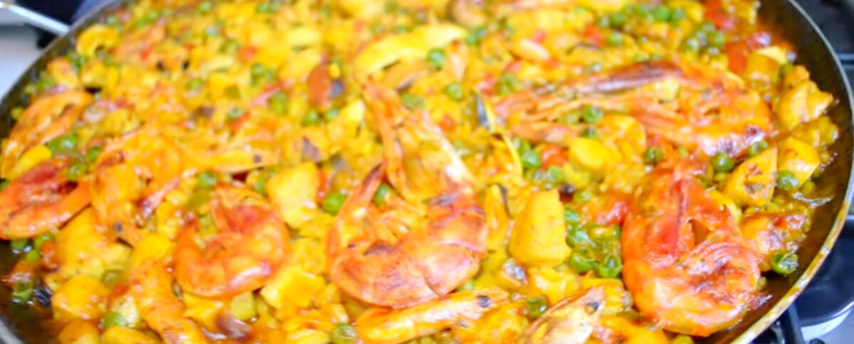 Что нам понадобится для приготовления: Рыбный бульон - 2л. Рис - 500г. Филе куриное - 300г. Кальмары - 100г. Мидии - 100г. Ракушки - 100г. Креветки маленькие - 100г. Креветки большие - 8 шт. Филе рыбы - 80г. Зеленый горошек замороженный - 3-4 ст. ложки Перец красный болгарский - 1 шт. Перец зеленый - 1 шт. Томатный соус - 250г. Шафран - щепотка Специи для паэльи - по вкусу. Соль - по вкусу. Лимон - 1 шт. Чеснок - 2-3 зубчика Масло растительное - 70г Как приготовить: 1. Куриное филе нарезаем небольшими кубиками 2. Перец красный нарезаем средними кубиками, так же поступаем и с зеленым. 3. Сковороду с широкими краями ставим на огонь, наливаем растительное масло, обжариваем чеснок. 4. Чеснок убираем из сковороды и выкладываем кусочки куриного филе, немного солим и слегка обжариваем, добавляем красный перец. 5. Зеленый перец отправляем в сковороду к остальным ингредиентам, перемешиваем. 6. В этой же сковороде, освобождаем немного места для больших креветок, сдвинув все к одному краю, и обжа