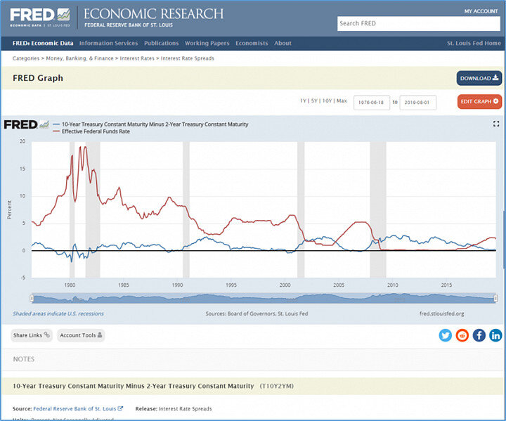 Грубо: приходите вы в банк сделать вклад. Вам предлагают вклад под 5% на один год. Вы хотите получить доход побольше и спрашиваете, какой будет процент по вкладу не на один, а на три года. И с удивлением узнаёте, что в этом случае получите 4% годовых. То есть доходность трёхлетнего вклада оказывается ниже, чем у вклада на один год. Вот это и есть та самая инверсия: вы ожидаете, что на более долгий срок будет более высокий процент (обычно так и бывает), но неожиданно узнаёте, что сейчас всё наоборот. На вопрос «почему?» работник банка может, например, ответить, что Центробанк, мол, ставки снижает, и брать сейчас под 5% на три года – это для банка риск. Ведь через год ставки по вкладам могут снизиться (например, до 3%) и тогда банк окажется в проигрыше, если примету вас сейчас деньги под более высокий процент. Главное: ожидание снижения ставки Центробанком. Кризисный индикатор Не вдаваясь в подробности: точно также, как и в нашем примере с вкладами, доходность (считай, те же самые проц