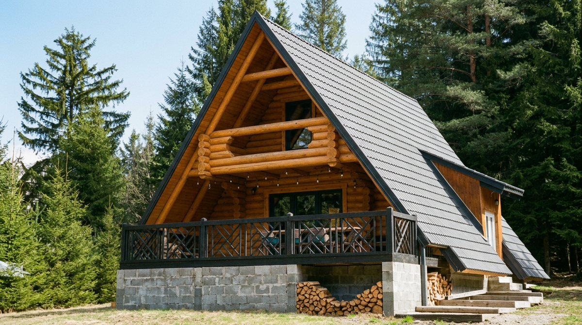 Шале из газобетона, как альтернатива постройкам из натурального камня и керамических стройматериалов, более доступны по общей стоимости строительства и возводятся за гораздо меньший срок. Использование газоблоков сделало такие уютные и сказочно красивые лесные домики более доступными. Шале или домик в альпийских горах угадывается по характерному стилю и гармоничной спокойной архитектуре без авангардных акцентов. Еще одна отличительная особенность – сочетание каменного основания и деревянных элементов, в том числе балок и перил в шале с балконом из массива натуральной древесины. Крыша шале – это не только покрытие дома, но и основной характерный элемент архитектуры альпийского домика. Она должна быть широкая, с небольшим уклоном. В конструкции крыши обязательно должна быть деревянная балка или отделка торцов деревом. В качестве основного материала можно использовать керамическую, металлическую или мягкую черепицу. Проект шале из газобетонных блоков должен включать в себя гармоничное