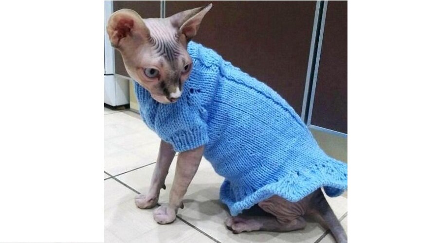 В моем портфолио на инстаграм много вариантов этой модели от нежно-розовых до малиновых оттенков. А теперь насыщенный голубой цвет подчеркивает нежный окрас кошки-сфинкс. Вам конечно известны преимущества индивидуального вязания-пошива! Для кошек породы сфинкс это особенно актуально. Фигуры сфинксов отличаются от остальных пород кошек своей более широкой талией. Посмотрите как хорошо село платье на кошку, связанное по ее меркам. Расширенное к низу платье скрыло животик, а оборка придала очарование. Если ваша киця ещё не в платье, пишите! viber/whatsapp +380506489200