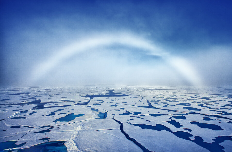 Пусть простят меня борцы за здоровый образ жизни, но иногда курение приносит весьма неожиданные и приятные результаты. Случилась эта история во время экспедиции на Северный Полюс на ледоколе «50 лет Победы». Началось всё в курилке. На ледоколе нельзя курить даже на палубе, есть только одно помещение в трюме на одной из самых нижних палуб корабля. Чтобы покурить мне приходилось сначала спуститься из каюты на пять палуб вниз, а потом эти же пять вверх. Но оно того стоило. Курилка – это просто кладезь историй. Туда приходили члены команды корабля и под сигаретку с чашечкой кофе начинались байки из разных походов. И вот однажды меня спрашивают: А ты видел белую радугу? От удивления у меня вытянулось лицо – я даже и не слышал о таком, не то чтобы видеть. Оказывается в Арктике можно встретить это уникальное явление. Узнав об этом чуде, я выбросил свою сигарету и со словами «Пошёл ждать белую радугу», отправился в каюту за фотоаппаратом. На фотоаппарат поставил широкоугольный объектив и г