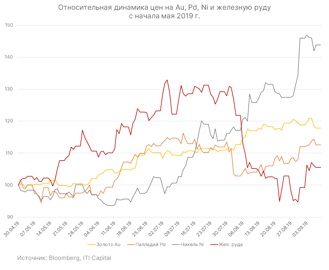 Цены на никель существенно выросли с конца августа на фоне планов Индонезии прекратить экспорт руды. Цены на железную руду и палладий восстанавливаются после падения в начале августа, а золото корректируется в связи с ослаблением торговой напряженности.