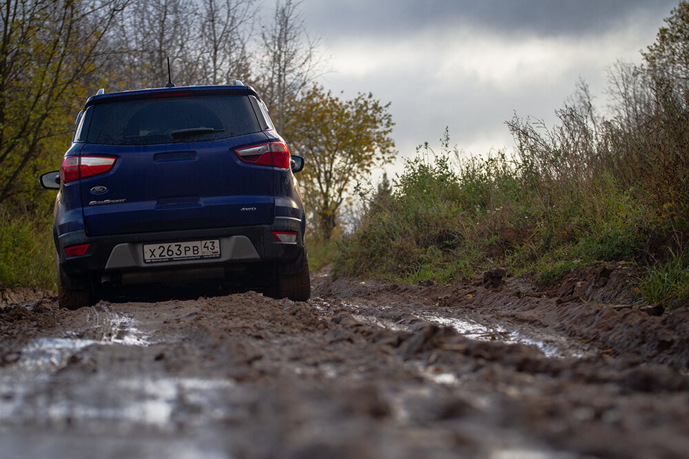Городские кроссоверы, такие как Ford EcoSport, довольно часто не блещут талантами и способностями: то у них нет полного привода, привет Xray, то у них проблемы с дизайном, привет Duster, то еще что-то. EcoSport от Ford так же не идеален и имеет свои изъяны, которые кто-то может отнести к вкусовщине, а кто-то и вовсе посчитать за должное. При первом знакомстве с машиной сразу бросается в глаза гипертрофированность кузова и пропорций, которые подчеркнуты маленькими колёсами. Внешне машина напоминает какого-то мультяшного героя. Это при том, что клиренс тут, как заявляет производитель, 200 миллиметров. Однако, если посмотреть сзади, то можно увидеть, как стабилизаторы свисают ниже оси, соответственно, зацепиться им за какую-нибудь корягу очень просто, а значит и фактический безопасный дорожный просвет меньше заявленного. Тем не менее, такой конструкторский просчет компенсирует полный привод. Он здесь доступен с двигателями 1,6 литра и 2 литровым мотором. Можно так же выбрать автоматическу