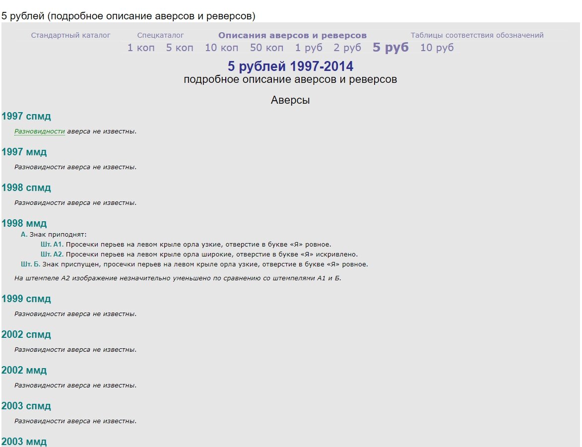 Каталог А.Сташкина. 5 рублей, подробное описание аверсов и реверсов.