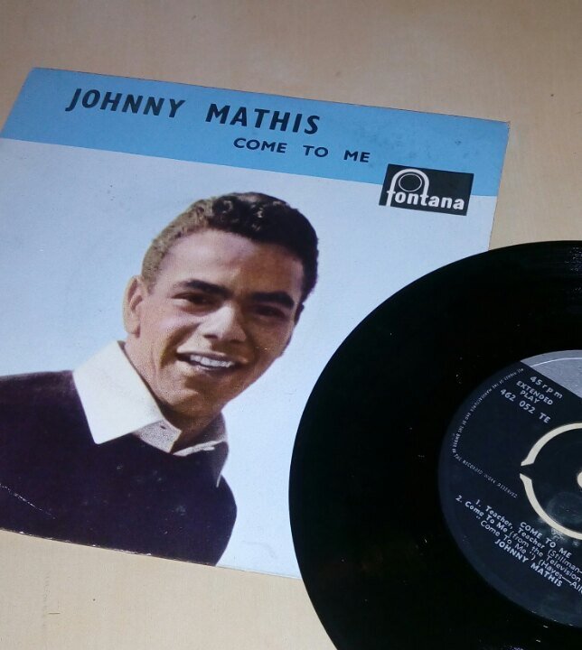 Доброго весеннего денечка вам, мои музыкальные друзья. Как говаривал Аркадий Велюров (Л. Броневой) в «Покровских воротах»: «На улице идет дождь, а у нас идет концерт…». В такой дождливый день хочется неспешной, негромкой, проникновенной музыки… А еще хочется, чтобы это была не просто музыка, а именно полноценная песня с хорошим вокалом, причем желательно с вокалом крунера (Crooner, от croon — напевать вполголоса, тихо и проникновенно). И как раз сегодня такая пластинка прилетела ко мне из Великобритании, уже ставшей главным поставщиком музыки для меня в последнее время. Семидюймовка-сорокопятка выпуска 1958 года (если начинаешь думать о судьбе пластинки, которая как-то до тебя жила почти 60 лет, меняя хозяев, дома, наблюдая за сменой поколений — в голове просто целый роман пишется сразу :-D) изданная Fontana Records и напечатанная Philips`ом в Англии вместила в себя 4 композиции замечательного вокалиста Джонни Мэтиса (Johnny Mathis). Как пишет про него Allmusic — «Очень успешный испол
