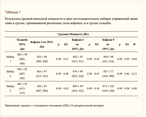 Проведенные ранее исследования подтверждают эргогенное действие кофеина. Но отсутствуют какие-либо научные данные о влиянии острого приема кофеина на выходную мощность у спортсменов, привычно потребляющих этот напиток. Предыдущие исследования показали, что потребление кофеина увеличивает выходную мощность. Но они были проведены на участниках с низким ежедневным потреблением кофеина. Данные об исследовании Основной целью настоящего исследования явилась оценка острого влияния 3, 6, 9 мг/кг кофеина на выходную мощность и скорость жима штанги лежа у спортсменов, привычно потребляющих кофеин. В исследование были включены 15 здоровых силовых атлетов мужского пола: Все участники до этого потребляли кофеин в дозировке (5,2±1,2 мг/кг тела или 426±102 мг кофеина в сутки. Результаты Повторные измерения между группами не выявили статистически значимых различий в выходной мощности и скорости штанги во время жима лежа. Результаты настоящего исследования свидетельствуют о том, что острые дозы кофеин