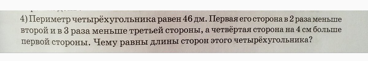 Ребенку задали задачку. 5 класс. На взгляд ничего сложного. Стали мы решать. Но... Оказалось не мы одни такие умные. У Ульяшкиной одноклассницы тоже с ответом не вышло. Заглянули в интернет, а там решений... Вагон и тележка. И все проверенны экспертом. Один из ответов привожу тут. Пусть Х (дм)-1 сторона тогда 2Х (дм)-2 сторона 3Х (дм)-3 сторона и (Х+4) дм-4 сторона Всего 46 дм х+2х+3х+х+4=46 7х+4=46 7х=46-4 7х=42 х=6 1).2*6=12(дм)-2 сторона 2).3*6=18(дм)-3 сторона 3).6+4=10(дм)-4 сторона Ответ:6 дм,12 дм,18 дм,10 дм. А теперь объясните мне... Как из 46 ДМ вычли 4 СМ и получили 42 ДМ??? У меня получилось 45ДМ и 6 СМ. Но никак не 42 ДМ. Может есть, кто знает КАК? P.S. Ну и для особо одаренных: в 5 классе с дробями пока не особо умеют обращаться. Данная задача не предусматривает ни дроби, ни десятые, не тем более сотые. Решаться должно без остатка.