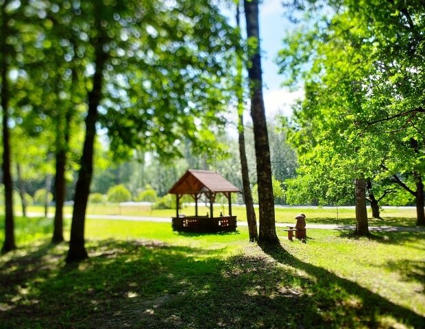 Летом я часто бываю на территории государственного заказника «Щучье озеро» под Зеленогорском. В этом году расписание местных автобусов неудобное, приходится долго ждать после электрички, поэтому я решила добираться от вокзала до леса пешком. Оказалось, что это занимает не так много времени – я добегаю за 20 минут. По дороге, между остановками 760 и 761 км, я обратила внимание на симпатичные беседки, но главный сюрприз был впереди. Однажды я решила подойти поближе, и буквально ахнула – в излучине небольшого ручья обнаружилось самое настоящее сказочное Лукоморье. Официальное название "Поляна Сказок". Как и положено в настоящей сказке, стоит на пути камень: «Налево пойдёшь — в густой лес попадёшь. Направо пойдёшь — сказку найдёшь. Прямо пойдёшь — здоровье обретёшь». За мостиком через ручей поселились сказочные персонажи. И кого тут только нет! И Баба-Яга, и лешие, и сказочные богатыри, и змей-горыныч… Горыныч мне, правда, больше напомнил слегка подгулявшего крокодила Гену, но всё р