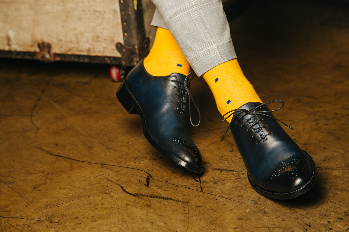Принято считать, что существует всего три цвета носков: черный, серый и коричневый. Именно эти цвета являются классическими и подходят для любой обуви и любого костюма. Однако современная мода устанавливает новые тренды, сегодня всё чаще нарушаются устоявшиеся правила и спектр цветов сильно расширяется. Во многом это происходит благодаря тренду на большую свободу самовыражения. Сейчас всё реже встречаются традиционные образы, а предпочтение отдается более ярким нарядам. Одним из довольно новых явлением стали контрастные носки, которые сильно отличаются от цвета как обуви, так и костюма. Однако это не значит, что можно брать любой цвет под любой образ. Даже при таком уровне свободы есть определенные правила: 1. Цветные носки в полоску нужно сочетать с таким же галстуком, но полоска должна быть толще и направленной в другую сторону. Ставьте лайки, если носки такого типа Ваши любимые. 2. Если Ваш выбор – носки в горошек, то также сочетайте их с галстуком. Однако в отличие от носков в