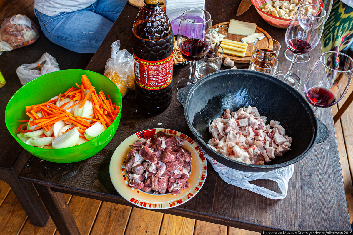 Готовить плов я люблю, пока ещё не достиг совершенства, но стремлюсь. На днях у меня случился очередной пловный дебют. Во-первых, готовил в новом казане, который нам подарили лет так 12 назад и вот он вылежался и дождался своего часа. Во-вторых, за неимением печи для казана и газовой плиты, казан поставили в мангал. Мангал широкий, если честно, то я надеялся, что кащан повиснет на стенках и между дном казана и дном мангала будет зазор. Зазора не было. Казан чётко стоял на дне мангала. Примечательно, но после готовки в мангале почти не осталось углей. Новый казан — это всегда волнительно – ибо боишься промахнуться с пропорциями ингредиентов. В этот раз чуть-чуть переборщил с курдюком, рисом, луком и морковкой. Из казана не вываливалось, но было на грани. И жирноват получился. Но зато какой была атмосфера при приготовлении. Компания, вино, сыр, погода, место. Хотя народ переживал за судьбу плова, тк накануне я ходил на день рождения с земляками сибиряками и был реальный шанс потерят