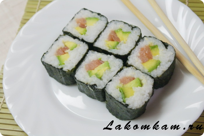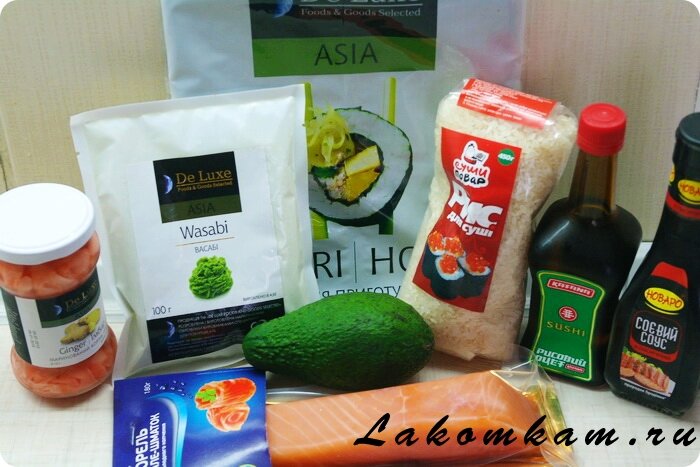 Ингредиенты: листы нори — 1 упаковка; рис для суши — 450 грамм; васаби; маринованный имбирь; соевый соус; рисовый уксус; авокадо — 1 штука; слабосоленая форель — 200 грамм.