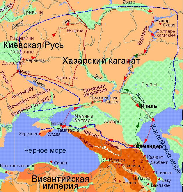 Во второй половине VIII века в Хазарском каганате произошли события, оказавшие существенное влияние на судьбы народов, входивших в его состав. Начало им положило принятие иудаизма как государственной религии. Одна из особенностей иудаизма заключается в том, что это узко национальная религия. Только евреи могли исповедывать эту религию. Евреем считался тот, чей матерью была еврейка. Жрецам понадобилось приложить много стараний, чтобы доказать еврейское происхождение кагана и его семейства. Большинство же населения и даже часть родственников кагана не были признаны евреями. В результате религиозной реформы к власти пришли люди, которые занимались теми видами деятельности, которыми занимаются лица еврейской национальности: ростовщичество, торговля, спекуляции. Встав во главе государства они увидели прекрасную возможность обогащения. В короткое время была изменена система налогообложения. Если раньше налоги можно было платить натуральной продукцией и ремесленными изделиями, то при новой власти налоги платились только серебряной монетой. Чтобы получить монеты земледелец или ремесленник должен был продать свою продукцию за деньги. Легко сказать, да трудно сделать: большая часть каганата обходилась без серебряных денег, используя в качестве денег беличьи шкурки. Чтобы продать продукцию за деньги её необходимо было везти на рынки, где в обращении были серебряные монеты. Такие рынки имелись в восточных странах (Хорезме) и в Византии. На торговых путях новая администрация поставила таможенные посты, собиравшие торговые пошлины. Размер пошлины - десятая доля стоимости товаров. Вследствие изменения формы уплаты налоги значительно выросли. Дело в том, что натуральные платежи имеют верхний предел: они ограничены уровнем потребления кагана, его чиновников, войска и т.д. Что касается денег, то они не имеют верхнего предела, т.к. серебряные деньги могут храниться не портясь длительное время и накапливаться в неограниченных размерах.