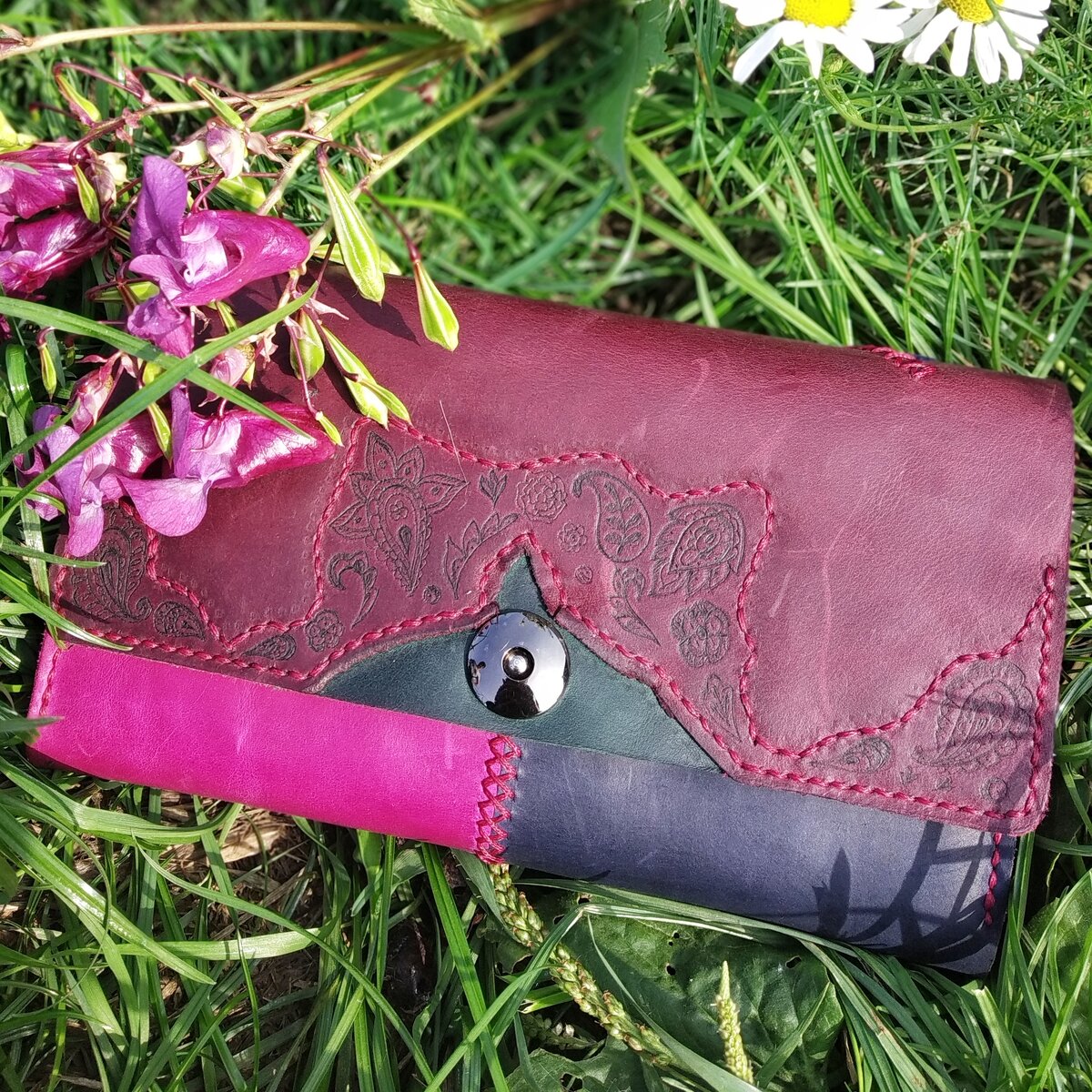 Готов наш кошелечек. Шили неделю , но мы это сделали . ⠀ Получился просто супер-кошелек. ⠀ С небольшими"изюминками". ⠀ Очень яркий, вместительный на магнитной кнопке☝. ⠀ Входит паспорт, документы на авто, телефон. Отдельный кармашек для купюр и три кармана под карты. ⠀ Повтор невозможен . В единственном экземпляре во всем мире. ⠀ Натуральная кожа Крейзи-хорс . Полностью ручной шов .