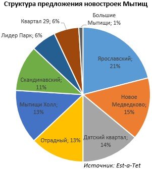 По состоянию на сентябрь текущего года совокупная величина предложения на первичном рынке жилья Мытищ в старых границах составляет 132,4 тыс. кв. метров в 37 корпусов 9 жилых комплексов. Крупнейшей по объему экспозиции новостройкой стал ЖК «Ярославский, в нем продается 27,9 тыс. кв. метров, или 21%, сообщает компания Est-a-Tet. Проект «Новое Медведково» занимает второе место, на него приходится 15%. Ненамного меньше продается в ЖК «Датский квартал», его доля равна 14%. На застройщика ГК ФСК приходится самый крупный объем - 25% предложения. Второе и третье места занимают ПИК и «Инград» с долями 21% и 15% соответственно. Однокомнатные квартиры составляют 41% в структуре экспозиции, двухкомнатные - 36%, трёхкомнатные – 17%. Доля многокомнатных объектов – всего 1%, студий – 5%. С января по июль в Мытищах было продано 2,7 тыс. квартир и апартаментов общим объемом 133,4 тыс. кв. метров. Наибольший спрос пришелся на проект «Отрадный» - 35,7 тыс. кв. метров, или 26,7%. В комплексах «Новое Медв