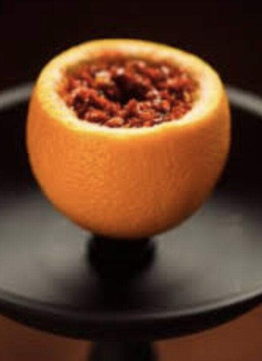 - сделать апельсиновую чашу, вырезать пропорционально технологические отверстия, так чтобы чаша села на шахту, сверху зубочистками сделать распоры, добавить табак, обвернуть фольгой и установить калауд