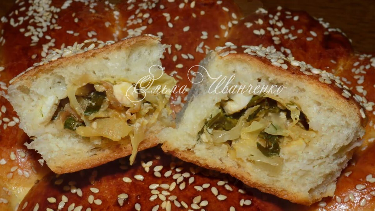 Предлагаю необычный способ формирования пирога. Всё делается очень просто, а внешний вид этой выпечки радует глаз.Тесто можно брать любое, понадобится от 500 до 800 г, в зависимости от того, какого размера пирог вы хотите сделать. Я взяла 800 г дрожжевого теста. Ингредиенты Капусту обжариваем на растительном масле и тушим до готовности, после добавляем зелень и 2-3 варёных яйца, солим и размешиваем. Тесто обминаем и делим на 4 части. Каждую часть раскатываем в лепешку. По тарелке вырезаем ровный круг. Разрезаем круг пополам и намечаем на каждой половине середины. Выкладываем начинку к срезу и каждую часть закручиваем трубочкой к центру (подробнее смотрите в ролике). Укладываем тесто в форме цветка, а после делаем середину: берём обрезки, формируем шар и раскатываем его, а после кладём начинку, защипываем в виде беляша, и укладываем в середину пирога. Смазываем пирог желтком, смешанным с молоком и посыпаем кунжутом, а после отправляем в духовку, разогретую до 180 градусов на 35 м