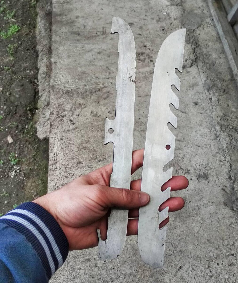 Здравия всем, друзья. Нашел у себя два лезвия от конька, поэтому очередной нож будет из нержавейки. Для начала сточил болгаркой все лишнее, придал клинку форму. В процессе обработки я понял, что данная заготовка имеет зонную закалку, что в принципе логично, обух будущего ножа легко поддается обработке надфилем, в отличии от лезвия. Проводя тест надфилем выяснил, что кончик ножа как и обух без закалки. На фото видно насечку Решил проверить еще и сверлом, в мягкой части без проблем можно сделать отверстие. Поэтому, придется изменить форму клинка, сделать скос от обуха Дальше буду делать спуски. Для этого использую грубый напильник с алмазным напылением и простое приспособление Пришлось попотеть, так как металл очень твердый, напильник заметно полысел). Хвостовик сделал тоньше. Дальше полирую клинок, начинаю с грубой наждачки 80 грит, постепенно повышаю зернистость, остановился я на 1500 грит. Вот так выглядит клинок, можно книгу читать)) Рукоять буду делать из бука, практичный и доступн