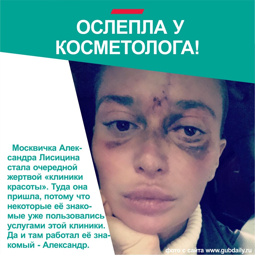 Москвичка Александра Лисицина стала очередной жертвой «клиники красоты». Туда она пришла, потому что некоторые её знакомые уже пользовались услугами этой клиники. Да и там работал её знакомый - Александр. Благодаря последнему девушка окончательно потеряла бдительность и согласилась не подписывать договор перед процедурой. После инъекций гиалуроновой кислоты, она ослепла на один глаз. После обследования за границей, конечно же за свой счёт, врачи вынесли вердикт – глаз больше не будет видеть никогда! Руководство клиники обвинило косметолога, сами они переехали – в общем, что и следовало ожидать. Друзья, будьте бдительны. Прежде чем записаться на процедуру, обязательно (!) проверяйте, есть ли у клиники лицензия, ведь серьёзные люди не будут так поступать – и в случае проблем сразу переезжать в другое место, убегая от ответственности. У косметолога тоже должно быть соответствующее образование. Всё читайте, изучайте. Да, это требует времени. Но лучше потерять его, чем здоровье!