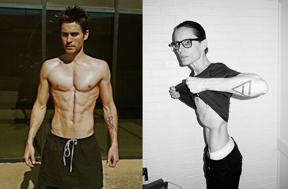 Есть в современном кинематографе такое понятие, как актеры одной роли. Вот, вроде бы, и жанр другой, и парик розового цвета надели, а все равно никак не отделаться от ощущения, что актриса играет одинаково во всех своих фильмах. Эта статья совсем не про таких, а о тех, кто готов кардинально измениться, чтобы сыграть максимально круто. На что только не пойдёшь, чтобы заработать лишний десяток миллионов долларов. Джаред Лето Этот вечно молодой красавчик всегда обладал привлекательным телом и имел много поклонниц. И судя по всему, виной этому отнюдь не внешность. Джаред один из тех знаменитостей, которые не держатся за свою внешность. Если его зовут на классную роль - он готов хоть набрать 30 килограмм, хоть столько же сбросить, причём в кратчайшие сроки. Так и произошло при подготовке к съемкам в фильме «Далласский клуб покупателей». Он сыграл транссексуала больного СПИДом, для этого потребовалось довести себя до веса в 53 килограмма. При росте в 175 сантиметров это довольно мало. Его с