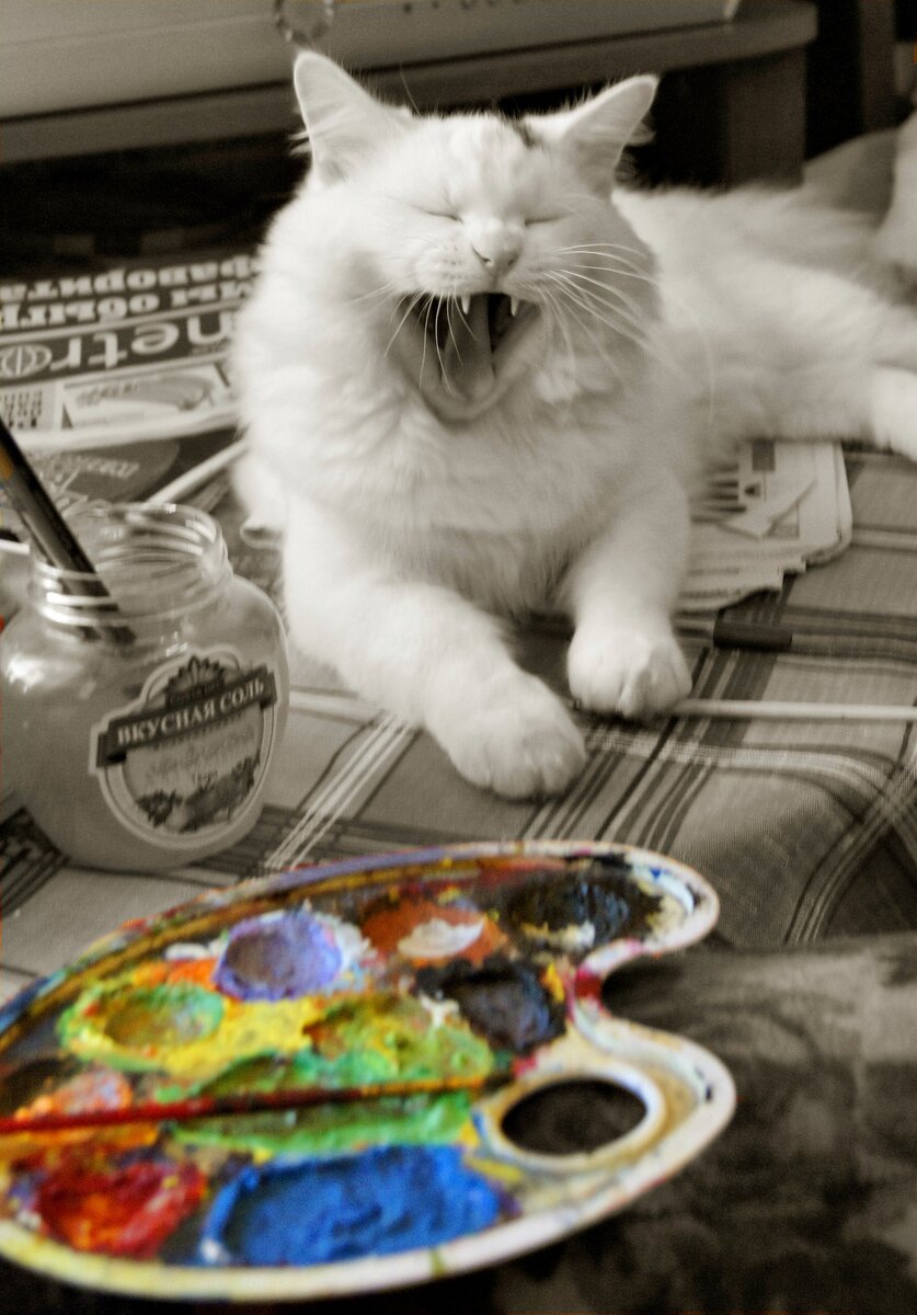 Моя хозяйка творческий человек. Всегда что-то придумывает, рисует, вырезает. Я люблю за ней наблюдать, а иногда пить воду из ее стаканчика где она кисти мокает. Иногда играю с этими палочками, у них на кончиках смешные волосики. Над последней картиной трудилась она долго, все время говорила что рисует меня. Я сидел гордо, почти не шевелился. Иногда спал в этой позе. Настал момент когда картина была закончена. Потом она покрыла ее каким-то прозрачным пахучим средством. Я даже не приближался. Она меня отгоняла и говорила что пока лак не засохнет подходить нельзя, а то прилип нет шерсть. Навсегда. И вот она взяла ее на руки и пошла показывать всем жителям дома. Все ее хвалили, говорили что произведение искусства прям. Потом дошло дело до меня. Она поставила ее на пол, я подошел и обнюхал ее. Сел и уставился. А где кот-то? Где собственно я на картине?? Ничего не понимаю. Вижу растения которые я люблю объедать, вижу что-то еще. Но себя не вижу. Ох уж это человеческое изобразительн