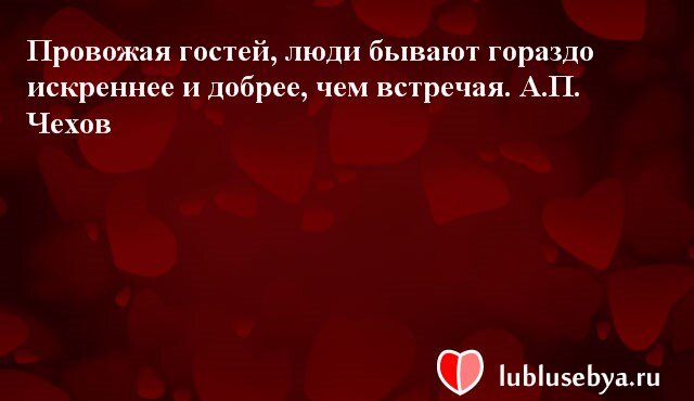 Провожая гостей, люди бывают гораздо искреннее и добрее, чем встречая. А.П. Чехов Копировать цитату Она поменяла все номера телефонов... Продала квартиру... Цитаты. Мысли великих людей в картинках. Подборка №lublusebya-30281222042019 Источник