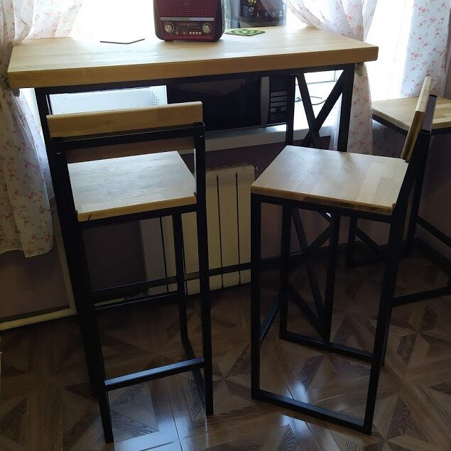 Семья принимает новое решение. Сделать этот тандем наслаждений традиционным. Добавив комфорт. Так у окна кухни встал новый стол. Высокий-барный. Именно он на фото. Как вам? Семья в восторге. Оберегают красавца: тарелки и стаканы - только на салфетки и подставки. Это, конечно, замечательно. И все же горячие блюда столу нипочем. Как и пролитые жидкости. Поцарапать его тоже сложно. Столешница - из массива дуба. Покрыта бесцветнм маслом. Материал крепкий, практичный, под мощной защитой. Основание из металлического профиля 25х25 мм. Черного матового цвета. Порошковая покраска. К столу - два барных стула. Тоже из дуба и металла. С нем
