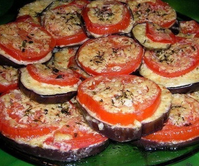 - Выкладываем баклажаны, посыпаем специями(специи по вкусу ), сверху ложим помидоры и выклываем поверх чеснок(можно заранее обтереть овощи чесноком ), сверху кусочки Моцарелла и посыпаем сыром.
