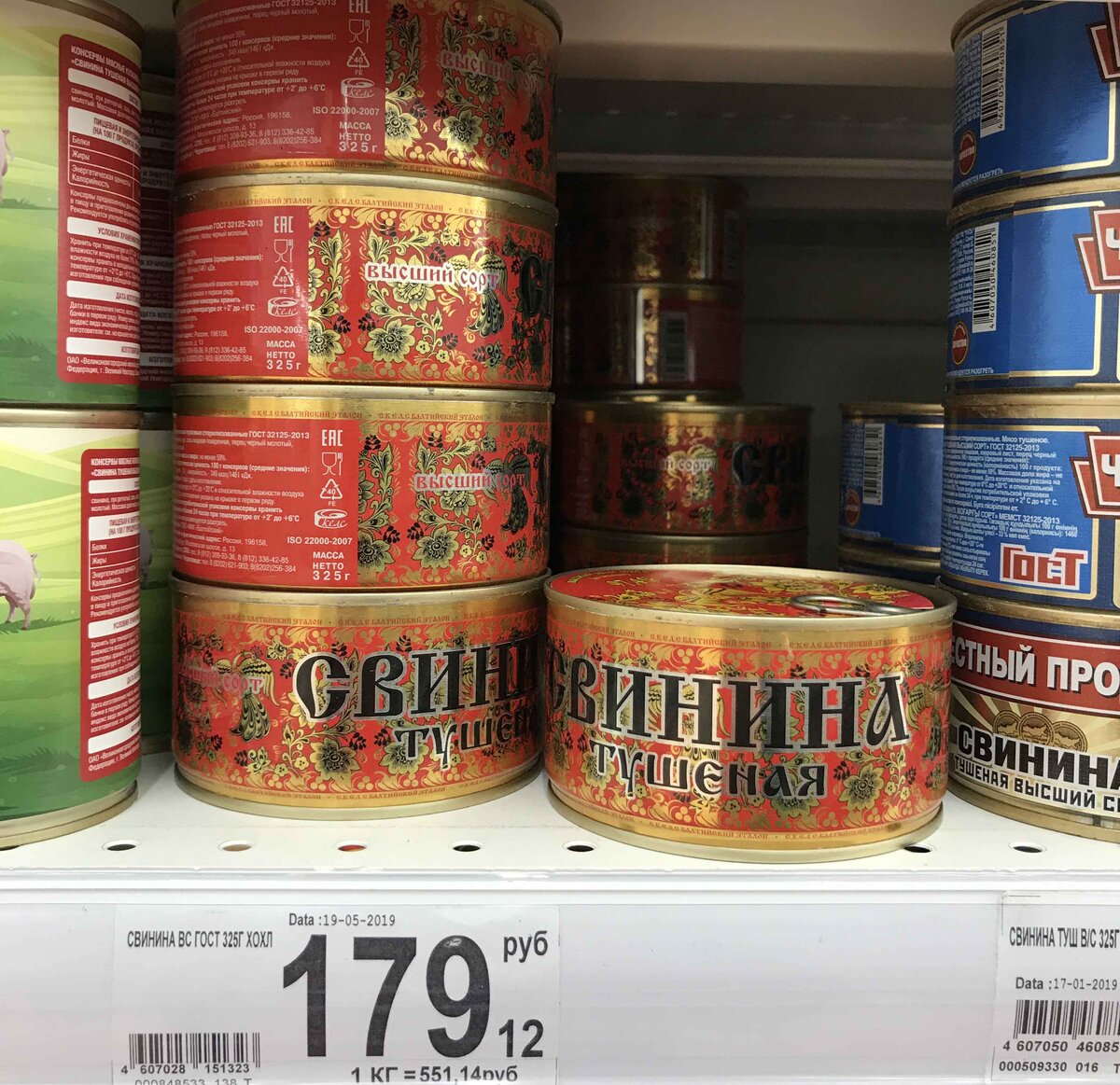 Всем привет, продолжаем продолжать наши тесты. Сегодня у нас на обзоре свинина тушеная, от ООО "МКК Балтийский", из г. Санкт-Петербурга. Куплена в Ашане за 179 рублей за банку 325 граммов. Килограмм выйдет 551 рублей, что как-то до фига. Купил из-за фееричного дизайна. Банка расписана под хохлому, с жар-птицами и прочими сказочными атрибутами. Проверим, насколько содержимое соответсвует внешности. К тому же мяса должно быть много, о чем нам свидетельствует надпись на крышке. Массовая доля мяса 97, 4% ! Что же, поглядим. Банка, конечно, прикольная, но нас, как всегда, больше волнует содержимое. Посмотрим, что внутри. Сразу видно, что жира не пожалели. Запах обычный, ничем особенным не пахнет. Рассмотрим поближе. Мда, мяса и не видно особо. Походу надпись про 97 процентов оказалось сказкой. Кто бы сомневался. Смотреть не это неприятно, но делать нечего, будем разогревать и пробовать. Всё расплавилось, сало и желе растопилось. Не растопились лишь огромные куски жира, типа вот таких