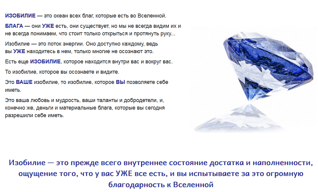 Изобилие Вселенной (Поток Изобилия) — энергия, предназначенная для удовлетворения всех наших потребностей и желаний (в еде, одежде, жилье, развлечениях, путешествиях, деньгах и т.д.). Это Божественное право любого человека, дарованное от рождения. 1. Привязанность к материальным ценностям Энергия Потока Изобилия блокируется в тех местах, где существуют сильные привязки к чему-либо. Дорогие читатели, решительно попрощайтесь с вещами, на которых лежит печать плохих воспоминаний: избавившись от них, вы проститесь и с застарелыми проблемами. А вещи, которые напоминают о хорошем — храните! Вещи, которыми вы не пользуетесь в течение длительного времени, лучше отдайте нуждающимся или выбросите. Ненужные старые вещи блокируют Поток Изобилия в жизнь. Освободившись от старого – вы освободите место для нового! К примеру, у вас лежат 2 пары б/у сапог, нуждающихся в ремонте, но у вас не доходят руки, чтобы их починить. В этом случае поток изобилия прерван, т.к. вы держитесь за старую обувь (в надеж