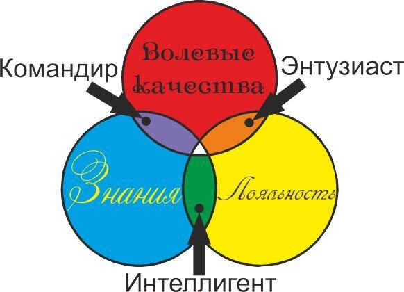 Давайте рассмотрим управленца как систему из трех базовых компонентов: волевые качества, знания, лояльность. Из анализа приведенной схемы мы получаем три выраженных роли управленцев: