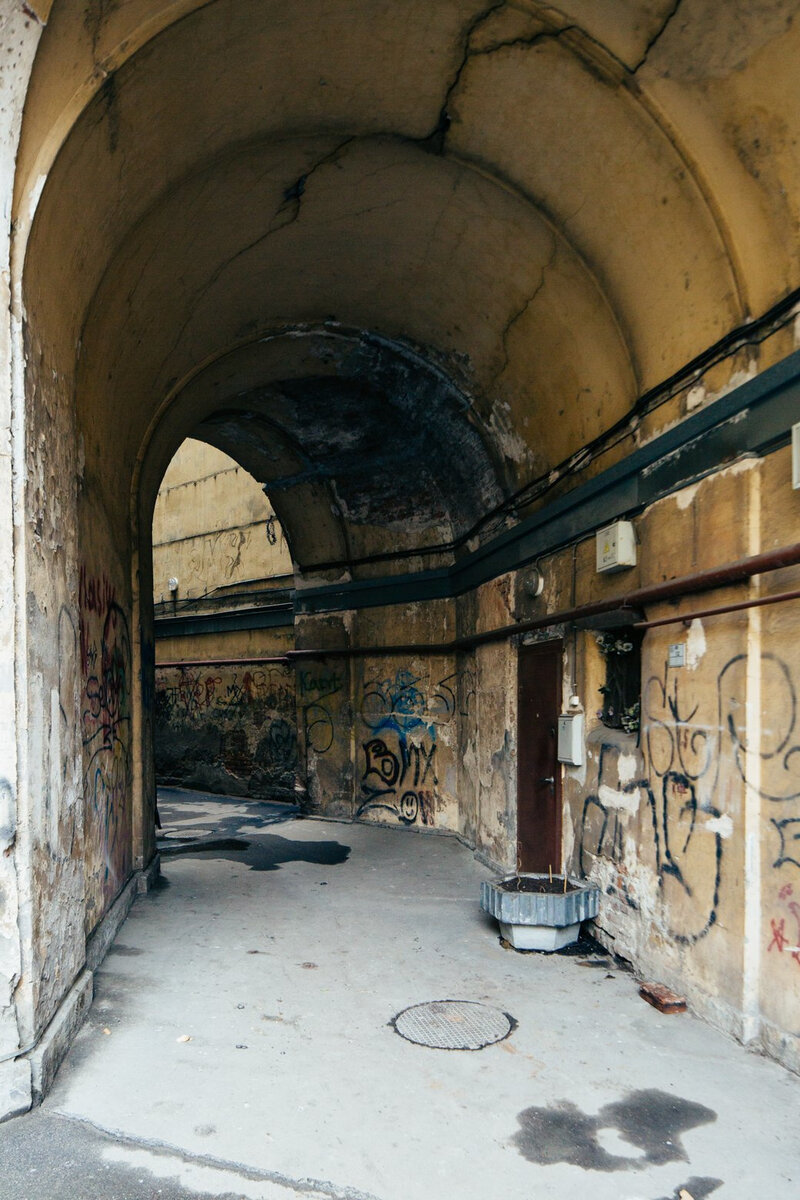 Для того, чтобы попасть во двор, вам нужно отыграть роль жильца этого старинного дома, ведь на входе вас встретит шлагбаум. Попав сюда, вы очень удивитесь инженерным мыслям архитектора Альфреда Краковского, который построил этот дом в далеком 1914 году. Только не заблудитесь в этом старинном лабиринте со световыми колодцами. Именно здесь можно сделать не только красивые фотографии на память, но и пропитаться эстетикой Петербурга. Дом находится по адресу: ул. Московская, 27-29.