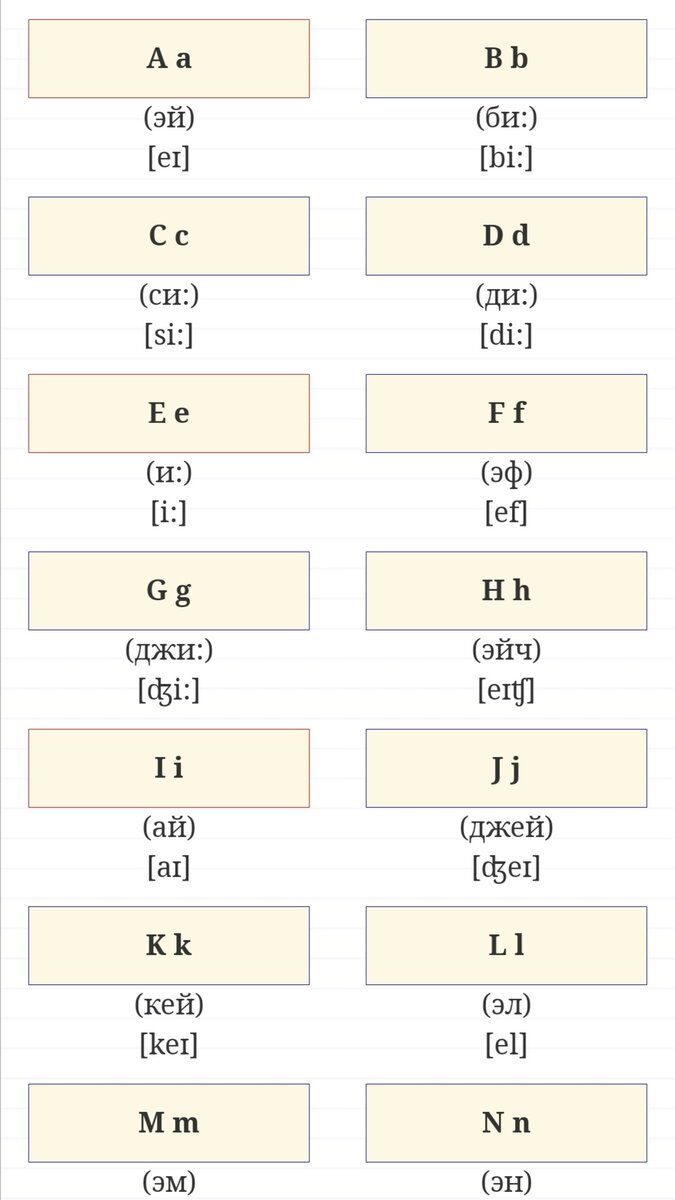 В алфавите у англичан всего лишь 26 букв: 5 гласных и 21 согласных. Это аж на семь букв меньше, чем у нас. Давайте же их скорее запомним. В круглых скобках указано примерное русское произношение букв английского алфавита. Двоеточие (:) показывает, что звук долгий. Выделение курсивом в букве R а: (р) означает, что в стандартном британском варианте языка буква R не произносится совсем. Например: car ≈ (ка:) автомобиль. В Америке, как и в некоторых районах Англии, эта буква звучит, но не так, как наша русская Р основная задача данного урока: научиться читать так, как написано в квадратных скобках, а не в круглых! В квадратных скобках указана транскрипция, т.е. правильное произношение. Но, прежде чем приступать к транскрипции, вы уверены, что выучили английский алфавит? Его учить обязательно. Почему? Во-первых, некоторые правила чтения связаны с произношением букв алфавита. Во-вторых, бывает так, что нам нужно уточнить, как пишется то или иное слово или имя. — My name is Beat