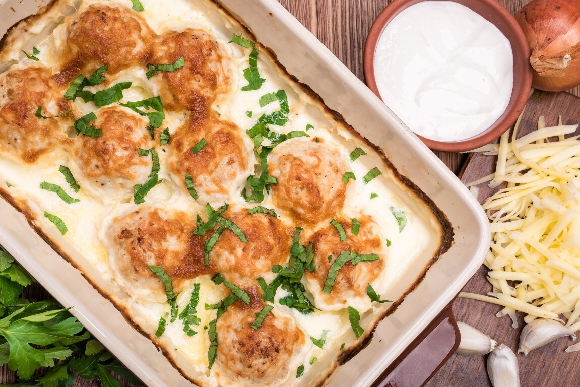 Добавляем еще одно коронное блюдо в свои супер рецепты. Удивим гостей и порадуем близких нежным вкусом. Состав: Способ приготовления: Куриное филе необходимо слегка отбить и мелко нарезать. Добавляем к филе мелко нашинкованный лук, солим, перчим, вбиваем яйцо. Все хорошо перемешиваем. Далее необходимо смазать форму сливками и выкладывать туда сформированные небольшие шарики. Отправляйте в разогретую до 180 градусов духовку на 10-15 минут.