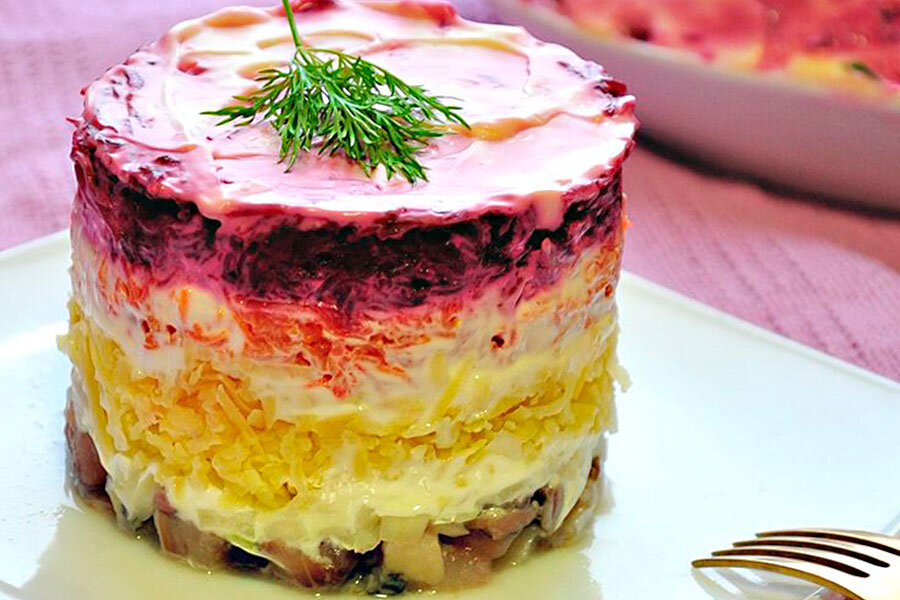 Основой стала сельдь – еда пролетариев. К сельди шёл репчатый лук, вареный картофель, морковь, а слой тертой свеклы сверху по замыслу автора должен был напоминать красное пролетарское знамя. И чтобы не забывать о врагах Советов, салат был заправлен французским соусом "майонез".
