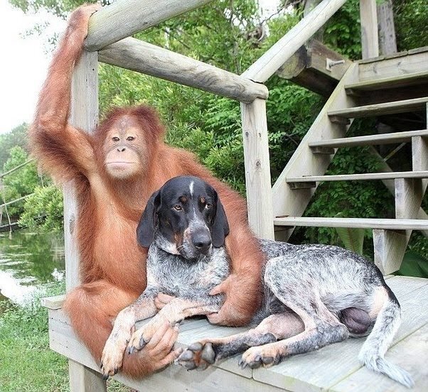 Собака дружит с орангутаном и они весело проводят время