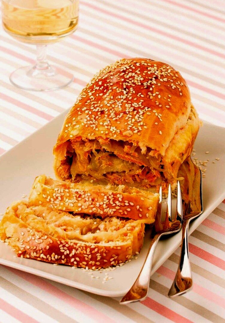 1.Тесто.Для этого 100мл водички смешать с дрожжами (сухие, 1/2 ч.л.) и всыпать муку (2ст.л.), оставляем в теплом месте на 15мин. 2.Доливаем еще 100 мл воды и муки (350гр), расплавленное слив. масло (80гр), яичко и соли (2/3 ч.л.).Замешиваем тесто и оставляем его подойти под пленкой на 1ч. 3.В это время готовим начинку.Лососевое филе (800гр), при желание можно любую другую рыбку, подсолить и добавить перчика на свое усмотрение , закутываем в фольгу отправляем в духовочку на 2 мин. при 180С. После этого даем остыть и нарезаем, как удобно. 4.Обжариваем пару головок лучка до золотистости. 5.Тесто приминаем и делаем из него небольшой прямоугольничек (примерно 35*25см). 6.Выложить на него рыбку, а поверх- лучок.Сворачиваем наше тесто вместе с начинкой рулетиком, прищипнув края. 7.Кладем рулетик в формочку для кекса с бумагой для выпечки и оставляем подойти на 20 мин. 8.После этого обмазать яичком рулетик и сверху немного сыпим кунжута.Ставим в дух. шкаф на 45-60 мин. при 180С.После