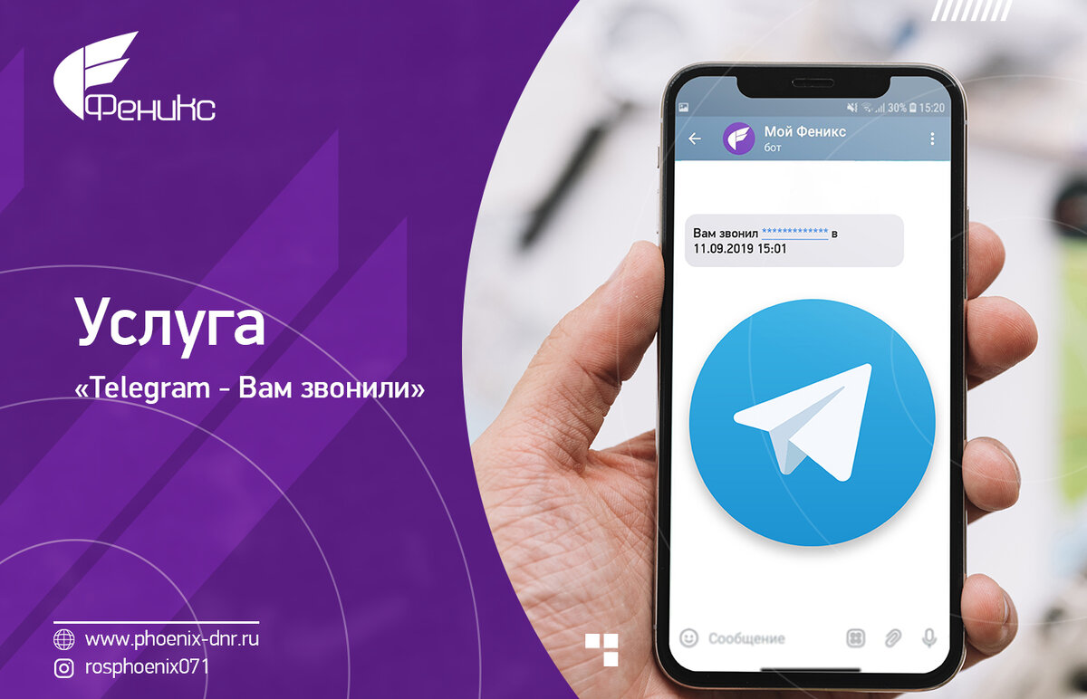 С 12 сентября всем абонентам мобильного оператора «Феникс» доступна новая услуга – «Telegram - Вам звонили», которая позволяет получать уведомления в боте «Мой Феникс» о пропущенных вызовах в то время, когда телефон абонента выключен или находится вне зоны действия сети. Активировать услугу «Telegram - Вам звонили» можно следующим образом: 1) в Личном кабинете на нашем сайте https://my.phoenix-dnr.ru/. Для этого необходимо войти в личный кабинет -> выбрать «услуги» -> «все услуги» -> услуга «Telegram - Вам звонили» -> подтверждение подключения услуги. 2) через Telegram-бот «Мой Феникс» https://t.me/myphoenix_bot. Для этого необходимо авторизоваться в Telegram-боте «Мой Феникс» -> в меню бота выбрать «Управление счетом» -> услуги -> подключить услуги -> выбрать из списка «Telegram – Вам звонили -> подтвердить. 3) через USSD-запрос: *110*31# ОБРАТИТЕ ВНИМАНИЕ: 1) для получения уведомлений необходимо быть авторизованным в Telegram-боте «Мой Феникс»; 2) услуга не работает, если устано