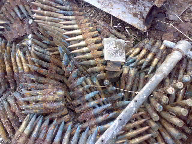 Время осень, надо успевать копать, чтобы потом руки не чесались полгода в ожидании апреля. Решили мы рвануть на коп - друган купил за 800 рублей карту одного района Ленобласти, где фронт стоял почти три года. Оказалось, почти рубас был истрачен весьма и весьма не зря. После 3-х часов скитаний по кустам вдоль болота мы поняли что стоим на блиндаже! И закипела работа! Очень скоро мы работали в одних футболках, правда, пришлось густо обрызгать себя рефтамидом. Сначала сбоку от блина, видать там, где стоял ЭМГЭШКА, попёрли ленты, живые, не рвутся, кусками по полтиннику. Нашли далее фляжку и антабку к ней. Естественно, где фляги там и котелки, ложки-вилки, но радость нам доставили немецкие каски. Шапочки были на редкость в хорошем сохране - краска целая, свастон и курица на месте. Кстати, демонстрация данного символа не несёт никакой пропаганды - это просто коп. Большая редкость - жетон без хозяина. Жетончик живой. Как и положено уйма алюминиевых пустых сигнальниц 42 и 43 года выпуска,