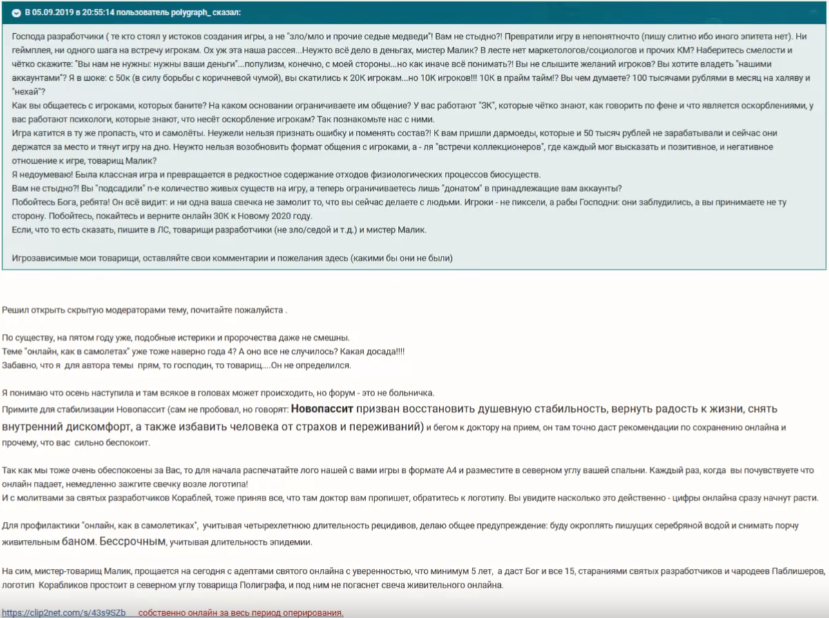 Вы таки хотите узнать за зашквар и истерику? Таки мне есть что вам рассказать ! Мы начинаем. На днях а точнее 5 сентября ,на форуме кораблей World of Warships ,вышла тема , которую сразу подтерли модераторы (обычное дело) сто раз так делал (нарвался на перманентный бан) тема о страхе ВГ за критику здесь ( https://zen.yandex.ru/media/id/5b5239609b38ef00a9d998bc/kritika-wargamingpochemu-ee-boiatsia-razrabotchiki-5d651b0698fe7900ac17564c) .Но тут пришло лицо обличенное властью и о чудо ....тему вернули , лишь за тем что бы всласть поистерить А в чем же дело ,что случилось ,что за паника в глазах? Все просто , один из бетатестеров на форуме написал о том о чем пишу постоянно я здесь- о падении онлайна,о том что проект скатывается ,о том что от игроков нужно только одно -бабло. И вот когда зашла речь о падении онлайна , то у лица обличенного властью началась сущая истерика. Он даже кинул ссылку на статистику онлайна за весь период -глупо и бездарно и вот к этому мы переходим , собственно