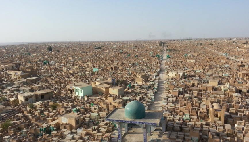 Самое большое кладбище в мире находится в Ираке и называется «Wadi Al Salam» («долина покоя»). Там похоронено более 5 млн мусульман, в том числе многие пророки, мыслители и государственные деятели. Вся площадь кладбища занимает 6 квадратных километров и могилы там расположены просто впритык.