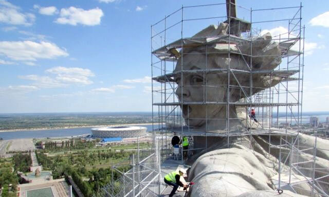 Самый большой и сложный памятник России сегодня опутан плотной сетью строительных лесов, вес которых достигает 270 тонн. В разгаре реконструкция монумента. Это настоящая спецоперация, аналогов которой еще не было. Ведь и подобной конструкции из бетона нет больше нигде. Ветер и перепады температур существенно состарили скульптуру. Сейчас она исчерчена красными и черными линиями, аккурат как женщина перед пластической операцией. Здесь демонстрируют высший пилотаж монтажники-высотники, которые обрабатывают бетон фрезами и отбойниками. Им предстоит сгладить более 14 км морщин. Несмотря на то, что свое время в монументе использовали самый высококачественный материал, такой же как при строительстве ГЭС, годы и суровый климат сделали свое дело. Для реконструкции используются самые передовые зарубежные материалы, которые еще недавно были экспериментальными, но за два года опытов показали себя просто превосходно. Основная проблема – влажность и то, что у статуи нет центральной опорной оси, н